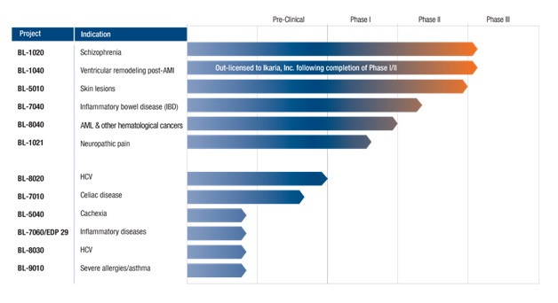 In accordance with the agreement, Ikaria is obligated to use commercially reasonable efforts to complete clinical development of and to commercialize BL-1040, and will bear all subsequent costs involved in the continued development of the product, the conduct and funding of its commercialization, and the prosecution and maintenance of patents.