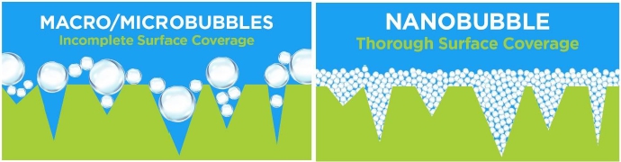Since nanobubbles have no natural buoyancy, they remain underwater, where each tiny, negatively charged bubble is attracted to positively charged pollutants and harmful toxins. In the article, Seridou and Kalogerakis write about how this union causes the nanobubbles to release ozone which extinguishes pathogens and slowly breaks down the cell walls of mold, germs, and other residues. Further, a smaller size of nanobubbles is also more effective as it has a higher density of ozone and is able to provide a more thorough surface coverage, which destroys a higher number of contaminants.