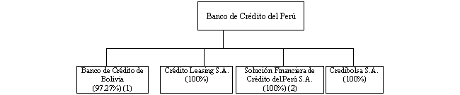 Credicorp operates primarily through its four principal subsidiaries, Banco de Crédito del Perú (together with its consolidated subsidiaries, “BCP”), Atlantic Security Holding Corporation (together with its consolidated subsidiaries, “ASHC”), El Pacífico-Peruano Suiza Compañía de Seguros y Reaseguros (together with its consolidated subsidiaries, “PPS”), and Banco Tequendama. BCP’s activities include commercial banking, investment banking activities, and retail banking. As of and for the year ended December 31, 2002, BCP accounted for 86.6% of Credicorp’s total revenues, 82.7% of total assets, 141.2% of net income and 62.8% of shareholders’ equity. Unless otherwise specified, the individual financial information for BCP, ASHC and PPS included herein has been derived from the audited consolidated financial statements of each such entity. See “Item 3. Key Information–(A) Selected Financial Data” and “Item 4. Information on the Company– (A) History and Development of the Company.”