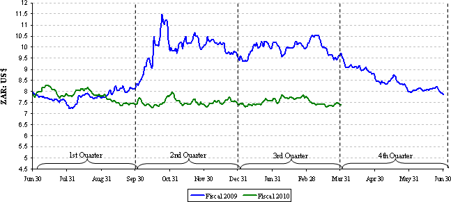 We are subject to currency exchange risk because we purchase inventories that we are required to settle in other currencies, primarily the euro and US dollar. We have used forward contracts to limit our exposure in these transactions to fluctuations in exchange rates between the ZAR, on the one hand, and the US dollar and the euro, on the other hand. As of March 31, 2010 and 2009, our outstanding foreign exchange contracts were as follows: