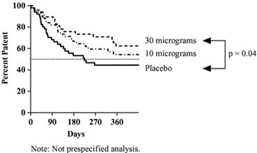 We also conducted a non-prespecified analysis across all patients of the primary endpoint correcting for this uneven distribution in central stenoses. The following Kaplan-Meier curves for primary unassisted patency for all AVFs (excluding central stenoses) and table demonstrate a significant reduction in the risk of primary unassisted patency loss for the 30 microgram dose (p=0.04, for the 30 microgram dose) versus placebo. Treatment with vonapanitase at doses of 10 and 30 micrograms was associated with a reduction of 31% and 48%, respectively, in the risk of primary unassisted patency loss. After adjusting for differences in baseline characteristics associated with the risk of primary unassisted patency loss, treatment with vonapanitase at doses of 10 and 30 micrograms was associated with a reduction of 25% and 52%, respectively, in the risk of primary unassisted patency loss.