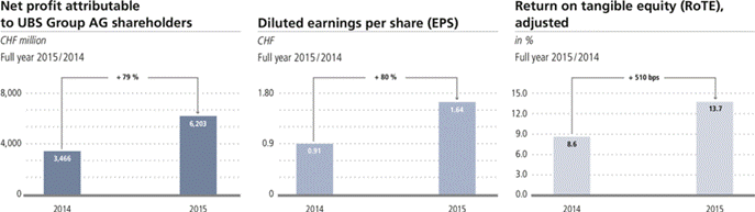 Cautionary StatementRegarding Forward-Looking Statements | This report contains statements that constitute “forward-looking statements,” including but not limited to management’s outlook for UBS’s financial performance and statements relating to the anticipated effect of transactions and strategic initiatives on UBS’s business and future development. While these forward-looking statements represent UBS’s judgments and expectations concerning the matters described, a number of risks, uncertainties and other important factors could cause actual developments and results to differ materially from UBS’s expectations. These factors include, but are not limited to: (i) the degree to which UBS is successful in executing its announced strategic plans, including its cost reduction and efficiency initiatives and its targets for risk-weighted assets (RWA) and leverage ratio denominator (LRD), and the degree to which UBS is successful in implementing changes to its wealth management businesses to meet changing market, regulatory and other conditions; (ii) the continuing low or negative interest rate environment, developments in the macroeconomic climate and in the markets in which UBS operates or to which it is exposed, including movements in securities prices or liquidity, credit spreads, and currency exchange rates, and the effect of economic conditions and market developments on the financial position or creditworthiness of UBS’s clients and counterparties; (iii) changes in the availability of capital and funding, including any changes in UBS’s credit spreads and ratings, as well as availability and cost of funding to meet requirements for debt that will be eligible for total loss-absorbing capacity (TLAC) requirements, or loss-absorbing capital; (iv) changes in or the implementation of financial legislation and regulation in Switzerland, the US, the UK and other financial centers that may impose, or result in, more stringent capital, TLAC, leverage ratio, liquidity and funding requirements, incremental tax requirements, additional levies, limitations on permitted activities, constraints on remuneration or other measures; (v) uncertainty as to when and to what degree the Swiss Financial Market Supervisory Authority (FINMA) will approve reductions to the incremental RWA resulting from the supplemental operational risk capital analysis mutually agreed to by UBS and FINMA, or will approve a limited reduction of capital or gone concern requirements due to measures to reduce resolvability risk; (vi) the degree to which UBS is successful in implementing changes to its legal structure to improve its resolvability and meet related regulatory requirements, including changes in legal structure and reporting required to implement US enhanced prudential standards, implementing a service company model, the transfer of the Asset Management business to a holding company, and the potential need to make further changes to the legal structure or booking model of UBS Group in response to legal and regulatory requirements relating to capital requirements, resolvability requirements and proposals in Switzerland and other countries for mandatory structural reform of banks and the extent to which such changes have the intended effects; (vii) changes in UBS’s competitive position, including whether differences in regulatory capital and other requirements among the major financial centers will adversely affect UBS’s ability to compete in certain lines of business; (viii) changes in the standards of conduct applicable to our businesses that may result from new regulation or new enforcement of existing standards, including measures to impose new or enhanced duties when interacting with customers or in the execution and handling of customer transactions; (ix) the liability to which UBS may be exposed, or possible constraints or sanctions that regulatory authorities might impose on UBS, due to litigation, contractual claims and regulatory investigations, including the potential for disqualification from certain businesses or loss of licenses or privileges as a result of regulatory or other governmental sanctions; (x) the effects on UBS’s cross-border banking business of tax or regulatory developments and of possible changes in UBS’s policies and practices relating to this business; (xi) UBS’s ability to retain and attract the employees necessary to generate revenues and to manage, support and control its businesses, which may be affected by competitive factors including differences in compensation practices; (xii) changes in accounting or tax standards or policies, and determinations or interpretations affecting the recognition of gain or loss, the valuation of goodwill, the recognition of deferred tax assets and other matters; (xiii) limitations on the effectiveness of UBS’s internal processes for risk management, risk control, measurement and modeling, and of financial models generally; (xiv) whether UBS will be successful in keeping pace with competitors in updating its technology, particularly in trading businesses; (xv) the occurrence of operational failures, such as fraud, misconduct, unauthorized trading, financial crime, cyber-attacks, and systems failures; (xvi) restrictions on the ability of UBS Group AG to make payments or distributions, including due to restrictions on the ability of its subsidiaries to make loans or distributions, directly or indirectly, or, in the case of financial difficulties, due to the exercise by FINMA of its broad statutory powers in relation to protective measures, restructuring and liquidation proceedings; (xvii) the degree to which changes in regulation, capital or legal structure, financial results or other factors, including methodology, assumptions and stress scenarios, may affect UBS’s ability to maintain its stated capital return objective; and (xviii) the effect that these or other factors or unanticipated events may have on our reputation and the a
