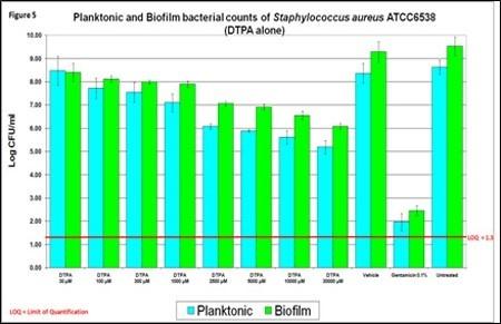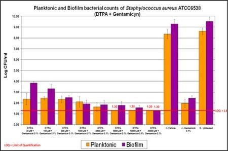 The concentration of Gentamicin 0.1% was kept constant in the study, since that is the FDA-cleared topical cream concentration. Ca-DTPA concentration was varied with the goal of achieving an optimal dose-response antimicrobial effect. Results revealed that the combination of both Gentamicin and Ca-DTPA is greater than the results achieved by Gentamicin alone or Ca-DTPA alone. In addition, no new chemical entities were formed within this formulation.