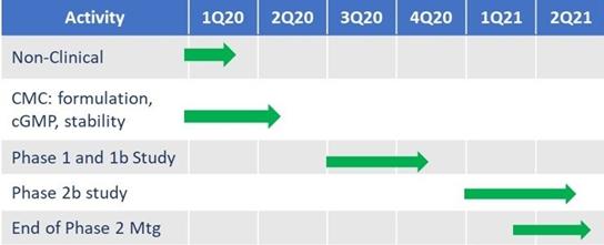 Following our Phase 1b trial, we intend to conduct up to two Phase 2 trials in atopic dermatitis patients comparing BioLexa to the base vehicle. Subject numbers and allocation will be informed by the results of the Phase 1b trial. We expect the clinical program to be completed, subject to receipt of funding by us, by the end of 2020 or early 2021 with an NDA submission targeted for mid to late 2021. There is currently no active IND for our product candidate in the United States.