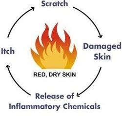 The main symptom of eczema is an inflamed, itchy red rash. It can appear all over the body. Many people have it on their elbows or behind their knees. Babies often have eczema on the face, especially the cheeks and chin. They can also have it on the scalp, trunk (chest and back), and outer arms and legs. Children and adults tend to have eczema on the neck, wrists, and ankles, and in areas that bend, like the inner elbow and knee. People with eczema are usually diagnosed with it when they are babies or young children. Eczema symptoms often become less severe as children grow into adults. For some people, eczema continues into adulthood. Less often, it can start in adulthood. The rash of eczema is different for each person. It may even look different or affect different parts of the body from time to time. It can be mild, moderate or severe. Generally, people with eczema suffer from dry, sensitive skin. Eczema is also known for its intense itch. The itch may be so bad that patients scratch their skin until it bleeds, which can make the rash even worse, leading to increased inflammation and itching. This is called the itch-scratch cycle.