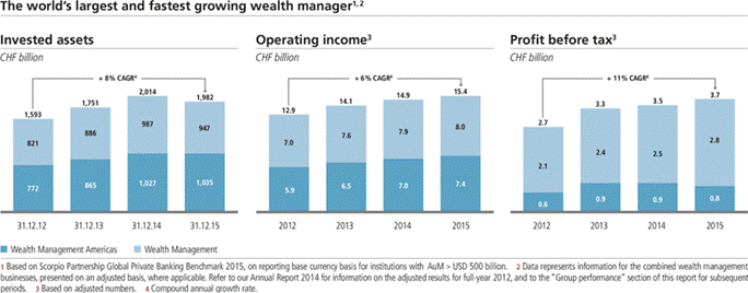 Cautionary StatementRegarding Forward-Looking Statements | This report contains statements that constitute “forward-looking statements,” including but not limited to management’s outlook for UBS’s financial performance and statements relating to the anticipated effect of transactions and strategic initiatives on UBS’s business and future development. While these forward-looking statements represent UBS’s judgments and expectations concerning the matters described, a number of risks, uncertainties and other important factors could cause actual developments and results to differ materially from UBS’s expectations. These factors include, but are not limited to: (i) the degree to which UBS is successful in executing its announced strategic plans, including its cost reduction and efficiency initiatives and its targets for risk-weighted assets (RWA) and leverage ratio denominator (LRD), and the degree to which UBS is successful in implementing changes to its wealth management businesses to meet changing market, regulatory and other conditions; (ii) the continuing low or negative interest rate environment, developments in the macroeconomic climate and in the markets in which UBS operates or to which it is exposed, including movements in securities prices or liquidity, credit spreads, and currency exchange rates, and the effect of economic conditions and market developments on the financial position or creditworthiness of UBS’s clients and counterparties; (iii) changes in the availability of capital and funding, including any changes in UBS’s credit spreads and ratings, as well as availability and cost of funding to meet requirements for debt that will be eligible for total loss-absorbing capacity (TLAC) requirements, or loss-absorbing capital; (iv) changes in or the implementation of financial legislation and regulation in Switzerland, the US, the UK and other financial centers that may impose, or result in, more stringent capital, TLAC, leverage ratio, liquidity and funding requirements, incremental tax requirements, additional levies, limitations on permitted activities, constraints on remuneration or other measures; (v) uncertainty as to when and to what degree the Swiss Financial Market Supervisory Authority (FINMA) will approve reductions to the incremental RWA resulting from the supplemental operational risk capital analysis mutually agreed to by UBS and FINMA, or will approve a limited reduction of capital or gone concern requirements due to measures to reduce resolvability risk; (vi) the degree to which UBS is successful in implementing changes to its legal structure to improve its resolvability and meet related regulatory requirements, including changes in legal structure and reporting required to implement US enhanced prudential standards, implementing a service company model, the transfer of the Asset Management business to a holding company, and the potential need to make further changes to the legal structure or booking model of UBS Group in response to legal and regulatory requirements relating to capital requirements, resolvability requirements and proposals in Switzerland and other countries for mandatory structural reform of banks and the extent to which such changes have the intended effects; (vii) changes in UBS’s competitive position, including whether differences in regulatory capital and other requirements among the major financial centers will adversely affect UBS’s ability to compete in certain lines of business; (viii) changes in the standards of conduct applicable to our businesses that may result from new regulation or new enforcement of existing standards, including measures to impose new or enhanced duties when interacting with customers or in the execution and handling of customer transactions; (ix) the liability to which UBS may be exposed, or possible constraints or sanctions that regulatory authorities might impose on UBS, due to litigation, contractual claims and regulatory investigations, including the potential for disqualification from certain businesses or loss of licenses or privileges as a result of regulatory or other governmental sanctions; (x) the effects on UBS’s cross-border banking business of tax or regulatory developments and of possible changes in UBS’s policies and practices relating to this business; (xi) UBS’s ability to retain and attract the employees necessary to generate revenues and to manage, support and control its businesses, which may be affected by competitive factors including differences in compensation practices; (xii) changes in accounting or tax standards or policies, and determinations or interpretations affecting the recognition of gain or loss, the valuation of goodwill, the recognition of deferred tax assets and other matters; (xiii) limitations on the effectiveness of UBS’s internal processes for risk management, risk control, measurement and modeling, and of financial models generally; (xiv) whether UBS will be successful in keeping pace with competitors in updating its technology, particularly in trading businesses; (xv) the occurrence of operational failures, such as fraud, misconduct, unauthorized trading, financial crime, cyber-attacks, and systems failures; (xvi) restrictions on the ability of UBS Group AG to make payments or distributions, including due to restrictions on the ability of its subsidiaries to make loans or distributions, directly or indirectly, or, in the case of financial difficulties, due to the exercise by FINMA of its broad statutory powers in relation to protective measures, restructuring and liquidation proceedings; (xvii) the degree to which changes in regulation, capital or legal structure, financial results or other factors, including methodology, assumptions and stress scenarios, may affect UBS’s ability to maintain its stated capital return objective; and (xviii) the effect that these or other factors or unanticipated events may have on our reputation and the a