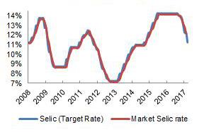 The widespread decline in inflation, due to the high level of idle capacity in the Brazilian economy and anchored inflation expectations, created an opportunity for the Central Bank to start a monetary easing cycle. After reaching 14.25% a.a. at the end of 2015, the Central Bank began to cut interest rates in October 2016. In April 2017, the Selic rate was at 11.25%. Bank lending as a proportion of GDP decreased to 49.3% in December 2016 from 53.7% in December 2015.
