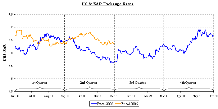 In ZAR, revenues decreased by 16% for the six months ended December 31, 2005, from the comparable period in 2004. Operating income decreased by ZAR 19% for the six months ended December 31, 2005, from the comparable period in 2004.