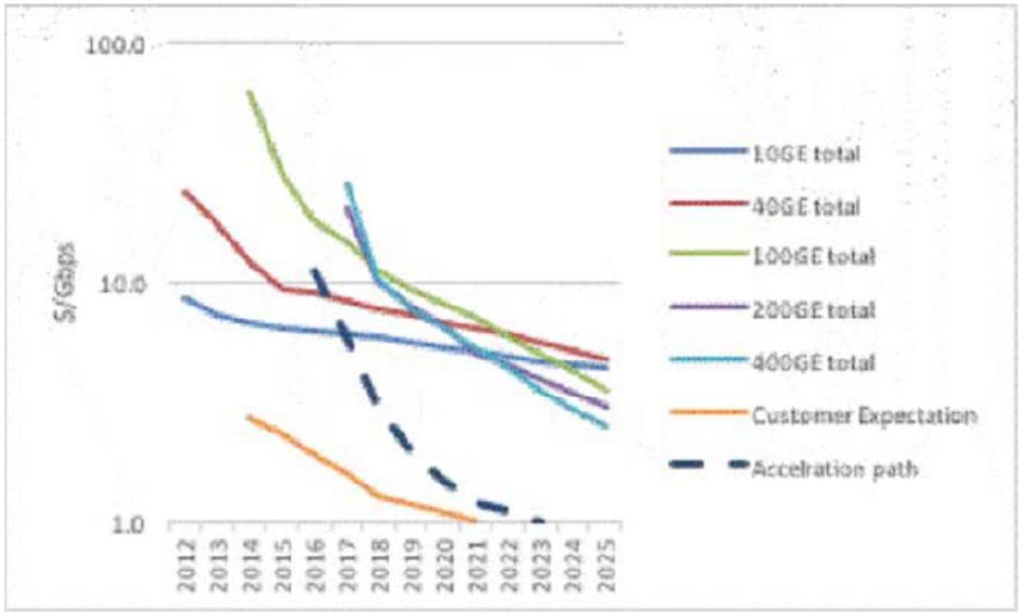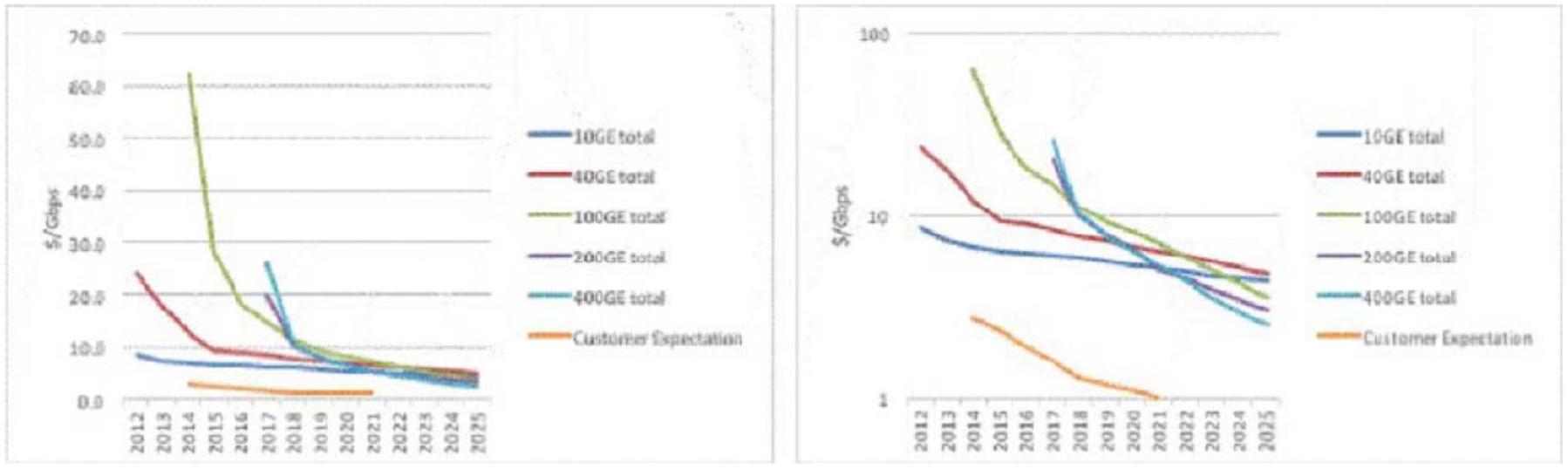 In the above figures that forecast $/Gbps to 2025 (where the left-hand graph is a linear vertical scale, and the right-hand graph is a log scale), it can be seen that the orange curve plots the customer expectation, while the other color curves