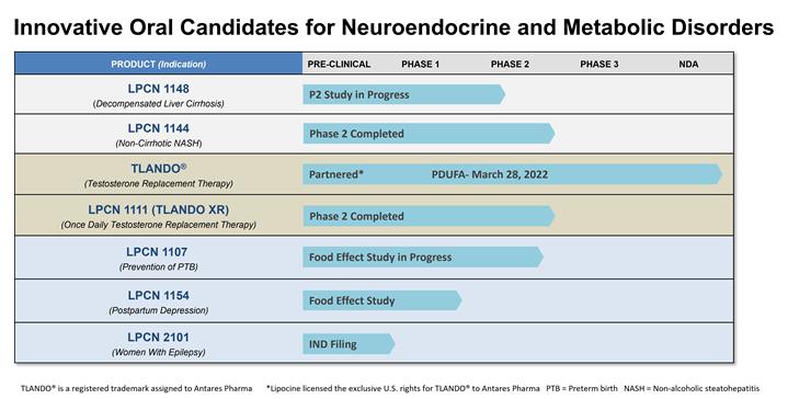Additional pipeline candidates include: LPCN 1148 comprising a novel prodrug of testosterone, testosterone laurate (“TL”), for the management of decompensated cirrhosis; LPCN 1144, an oral prodrug of androgen receptor modulator for the treatment of non-cirrhotic non-alcoholic steatohepatitis (“NASH”) which has completed phase 2 testing; LPCN 1111 (TLANDO® XR), a next generation oral TRT product comprised of testosterone tridecanoate (“TT”) with the potential for once daily dosing which has completed Phase 2 testing; LPCN 1107, potentially the first oral hydroxy progesterone caproate (“HPC”) product indicated for the prevention of recurrent preterm birth (“PTB”), which has completed a dose finding clinical study in pregnant women and has been granted orphan drug designation by the FDA; and neuroactive steroids (“NAS”) including LPCN 1154 for postpartum depression (PPD) and LPCN 2101 for epilepsy.