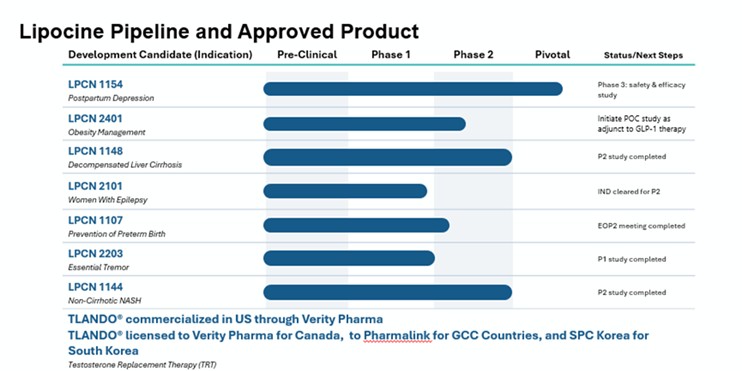 Additional clinical development pipeline candidates include: LPCN 1154 for postpartum depression (“PPD”); LPCN 2101 for epilepsy; LPCN 2203 for essential tremor and LPCN 2401 for improved body composition in obesity management. In addition to our clinical development product candidates, we have assets for which we expect to seek partnerships to enable further development including TLANDO for territories outside of the United States, South Korea, and the GCC, LPCN 1148 comprising a novel prodrug of testosterone and testosterone laurate (“testosterone laurate” or “TL”), for the management of cirrhosis, LPCN 1144, an oral prodrug of androgen receptor modulator for the treatment of metabolic dysfunction-associated steatohepatitis (“MASH”), formerly referred to as non-cirrhotic non-alcoholic steatohepatitis (“MASH”), which has completed Phase 2 testing; and LPCN 1107, potentially the first oral hydroxy progesterone caproate (“HPC”) product indicated for the prevention of recurrent PTB, which has completed a dose finding clinical study in pregnant women and has been granted orphan drug designation by the FDA.