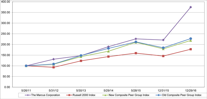 The Company’s Board of Directors has authorized the issuance of up to 750,000 shares of Common Stock for The Marcus Corporation Dividend Reinvestment and Associate Stock Purchase Plan. At December 29, 2016, there were 447,036 shares available under this authorization.