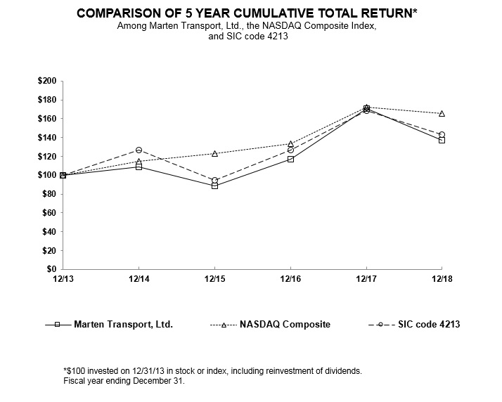 The following financial information from Marten Transport, Ltd.’s Annual Report on Form 10-K for the period ended December 31, 2018, filed with the SEC on March 1, 2019, formatted in eXtensible Business Reporting Language (XBRL): (i) Consolidated Balance Sheets as of December 31, 2018 and December 31, 2017, (ii) Consolidated Statements of Operations for the three years ended December 31, 2018, (iii) Consolidated Statements of Stockholders’ Equity for the three years ended December 31, 2018, (iv) Consolidated Statements of Cash Flows for the three years ended December 31, 2018, and (v) Notes to Consolidated Financial Statements.