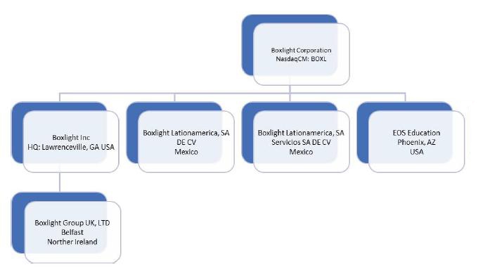 Boxlight Corporation was incorporated in Nevada on September 18, 2014 for the purpose of acquiring technology companies that sell interactive products into the education market. As of the date of this Annual Report, we have five subsidiaries, consisting of Boxlight Inc., a Washington State corporation, Boxlight Latinoamerica, S.A. DE C.V. and Boxlight Latinamerica Servicios, S.A. DE C.V., both incorporated in Mexico, Boxlight Group Ltd., a company incorporated in the UK, EOSEDU, LLC, a Nevada limited liability company and Modern Robotics Inc.