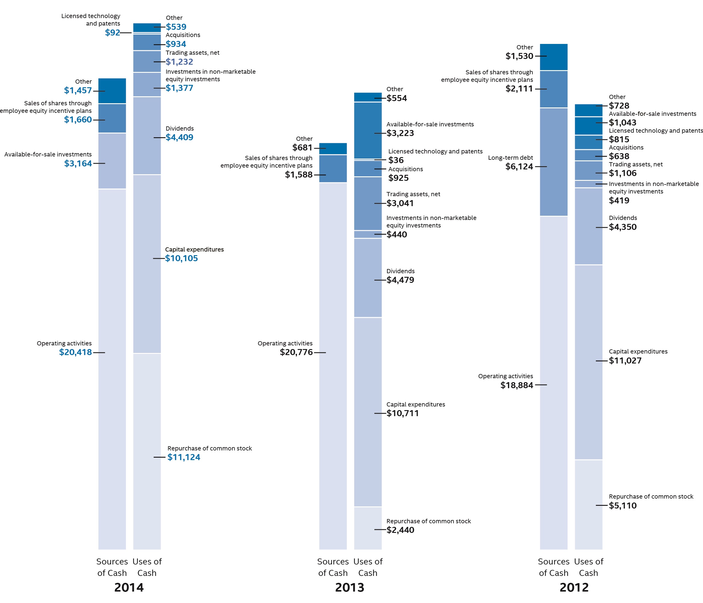 Strategic Investments. We make investments in companies around the world that we believe will further our vision, mission, and strategic objectives: support our key business initiatives: and generate financial returns. Our investments—including those made through Intel Capital—generally focus on companies and initiatives that we believe will stimulate growth in the digital economy, create new business opportunities for Intel, and expand global markets for our products. In 2014, we completed an investment in Cloudera, Inc. (Cloudera) to bring big data analytics into the mainstream through the joining of Cloudera's software platform and our data center architecture based on Intel® Xeon® processors. Additionally, we plan to continue to purchase and license intellectual property to support our current and expanding business.