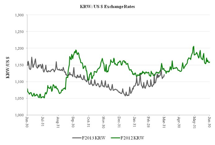 The following table illustrates the effect on our annual expected interest charge, translated at exchange rates applicable as of March 31, 2013, as a result of a change in the Korean CD rate. The effects of a hypothetical 1% increase and a 1% decrease in the Korean CD rate as of March 31, 2013, is shown. The selected 1% hypothetical change does not reflect what could be considered the best or worst case scenarios.