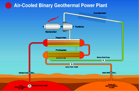 may be cooled by air or by water from a cooling tower. The condensed fluid is then recycled back to the heat exchanger, closing the cycle within the sealed system. The cooled geothermal fluid is then reinjected back into the reservoir. The binary technology is depicted in the graphic below.