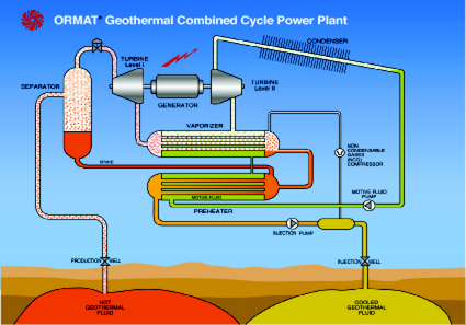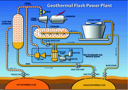In a plant using flash design, geothermal fluid is extracted from the underground reservoir and flows from the wellhead through a gathering system of insulated steel pipelines to flash tanks and/or separators. There, the steam is separated from the brine and is sent to a demister in the plant, where any remaining water droplets are removed. This produces a stream of dry saturated steam, which drives a turbine generator to produce electricity. In some cases, the brine at the outlet of the separator is flashed a second time (dual flash), providing additional steam at lower pressure used in the low pressure section of the steam turbine to produce additional electricity. Steam exhausted from the steam turbine is condensed in a surface or direct contact condenser cooled by cold water from a cooling tower. The non-condensable gases (such as carbon dioxide) are removed through the removal system in order to optimize the performance of the steam turbines. The condensate is used to provide make-up water for the cooling tower. The hot brine remaining after separation of steam is injected back into the geothermal resource through a series of injection wells. The flash technology is depicted in the graphic below.