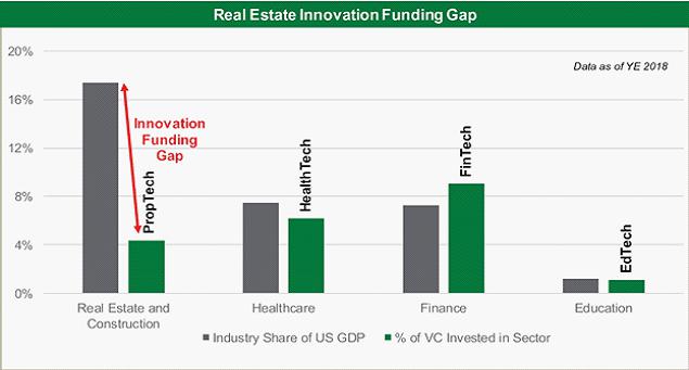 Real estate investment represents a significant segment of the U.S. economy. In 2018, the National Association of Real Estate Trusts estimated the total value of commercial real estate in the U.S. to be $16 trillion, and Zillow estimated the total value of residential real estate in the U.S. to be $33 trillion. According to the Bureau of Labor Statistics, real estate investment comprised the largest non-government share of U.S. GDP, with $3.3 trillion of total spending in 2018, representing 17.4% of U.S. GDP. Yet, nearly every industry other than real estate has been disrupted by new, innovative technologies, funded by a significant larger relative share of venture capital investment. Real estate, however, has received a relatively small share of venture capital investment. This disparity is particularly pronounced given the significant size of the real estate sector as a percentage of the U.S. economy. We believe this dynamic can be characterized as the real estate “innovation funding gap.”