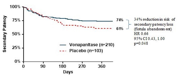 Secondary patency, the secondary endpoint in the PATENCY-1 trial, was defined as the length of time from surgical creation until fistula abandonment. Results suggested that vonapanitase may have improved secondary patency compared to placebo, as vonapanitase-treated patients demonstrated a 34% reduction in the risk of secondary patency loss (p=0.048). At the end of one year, 74% of vonapanitase-treated patients maintained secondary patency, compared to 61% of placebo-treated patients.