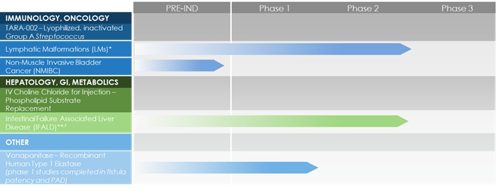 Our portfolio includes two development programs utilizing TARA-002, an investigational cell therapy based on the broad immunopotentiator, OK-432, which was originally granted marketing approval by the Japanese Ministry of Health and Welfare as an immunopotentiating cancer therapeutic agent. This cell therapy is currently approved in Japan for lymphatic malformations, or LMs, and multiple oncologic indications. It has never been approved outside Japan and we have secured worldwide rights to the asset excluding Japan and Taiwan and have begun to explore its use in rare and oncology indications. We are developing TARA-002 in non-muscle invasive bladder cancer, or NMIBC, and in LMs.