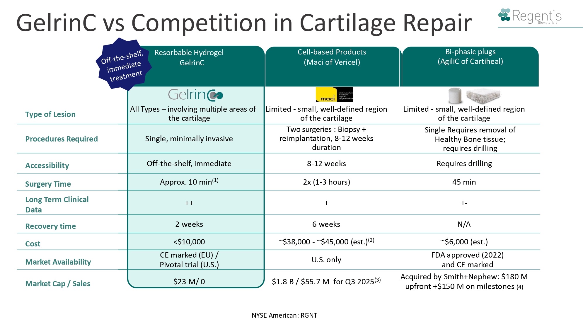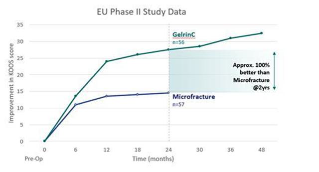 With GelrinC, we aim to bring to market a product for the therapy of an unmet need for the large market of cartilage injuries in the knee. Because GelrinC serves as an impenetrable barrier that stops cells from migrating away from the wound’s edges, we believe our product is the only product that helps to regenerate cartilage inwards from the edges of the cell walls. Creating new contiguous tissue is not the natural, lowest energy, alternative for cartilage cells. If such cells were left alone, they would tend to migrate and either not create new cartilage tissue or create cartilage tissue that is fibrotic (containing an excessive deposition of extracellular matrix, leading gradually to the disturbance and finally to loss of the original tissue architecture and function). By GelrinC creating such impenetrable barrier and thereby preventing the migration of the cells, the cells are forced to take a different route of creating aggregate and contiguous tissue. Unlike GelrinC, cellular products used by competing companies require a plug of two layers of which the lower layer is a mineral scaffold, which is a foreign body material that has been engineered to be inserted into the bone tissue even though the bone is often healthy. Additionally, GelrinC does not have any biological activity. As a result, we believe our product offers a simple and economic procedure, which we believe will allow patients to recover quickly with potentially long-term outcomes.