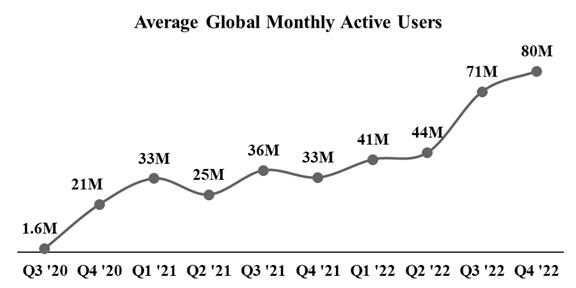 Soon after this, the preferencing and censorship enforced by big tech social platforms continued to expand into many other areas of content, including but not limited to the crypto-finance community and pop culture. As a result, more creators and their audiences found a new home on Rumble. These have included top creators, such as Dan Bongino, Russell Brand, Kim Iversen, Steve Will Do It, Dave Rubin, Kimberly Guilfoyle, Glenn Greenwald, Matt Kohrs, and Dana White, just to name a few. As a result, our user base has grown from 21 million MAUs in Q4 2020 to 80 million MAUs in Q4 2022, almost quadrupling in two years.
