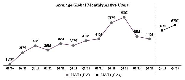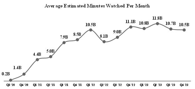 Soon after this, the preferencing and censorship enforced by the incumbent social platforms continued to expand into many other areas of content, including but not limited to the crypto-finance community and pop culture. As a result, more creators and their audiences found a new home on Rumble. These have included top creators, such as Dan Bongino, Russell Brand, Kim Iversen, Dave Rubin, Kimberly Guilfoyle, Glenn Greenwald, Matt Kohrs, and Dana White, just to name a few. As a result, our user base has more than tripled in three years, growing from 21 million MAUs (UA) in Q4 2020 to 67 million MAUs (GA4) in Q4 2023.