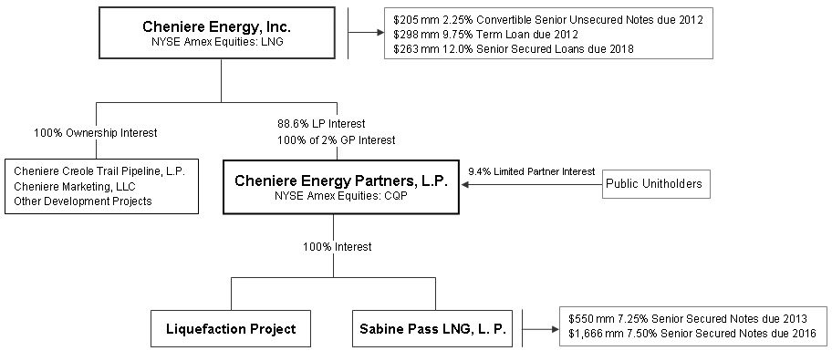 Our LNG and natural gas marketing business segment is pursuing a two-front commercial strategy focused on producing long-term recurring cash flow by capitalizing on 2.0 Bcf/d of regasification capacity at the Sabine Pass LNG terminal reserved by Cheniere Energy Investments, LLC ("Cheniere Investments"). Our strategy is to remain engaged in the LNG spot market as opportunities arise, and to maintain relationships with key suppliers and market p articipants that we believe are candidates for entering into long-term LNG cargo sales and/or the purchase of TUA capacity currently reserved by Cheniere Investments. Many of Cheniere Marketing, LLC’s natural gas purchase, sale, transportation and shipping agreements have been guaranteed by Cheniere. As of December 31, 2010, these contracts have been guaranteed by Cheniere and have a zero amount of exposure to the potential of future payments. There was zero carrying amount of liability related to these guaranteed contracts as of December 31,
