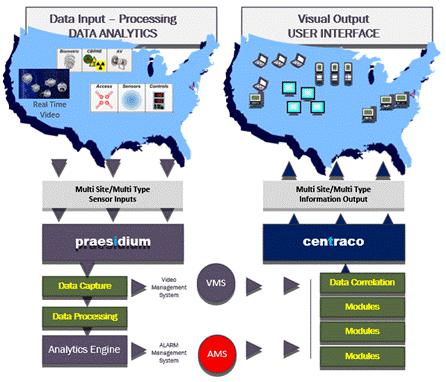 The core function of our praesidium® platform is the simultaneous processing and continuous analysis of data feeds from an unlimited number and types of sensors. All input data is algorithmically compared against specific, multi-dimensional, user defined rules. Anomalies are automatically flagged. Rules can be variable and/or conditional. In simple words: the result of an analytical test may be subject to an unlimited number of parameters, such as a specific time or a list of special conditions, and may result in different actions if such conditions change. The praesidium® platform essentially acts as the “back end” process that captures, organizes, analyzes and classifies the data streams. The built-in Alarm Management Module (“AMS”), which includes a powerful rules-based engine, automatically dispatches events considered actionable breaches of any rule. All data is passed on to and graphically visualized in our centraco® Physical Security Information Management (PSIM) user interface, which enables operators to view and respond to actionable events. The following diagram is a simplified topology of the interaction between the praesidium® back end process and the centraco® front end interface.