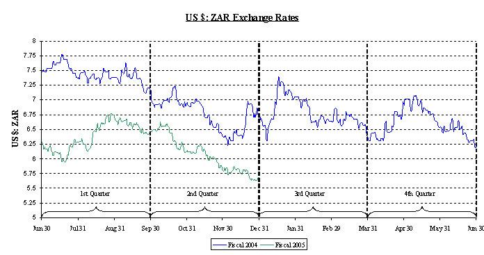 Interest on surplus cash increased from US$ 3.4 million (ZAR 23 million) for Q2 2004 to US$ 4.1 million (ZAR 24.9 million) for Q2 2005, primarily due to the increase in surplus cash held in the South African domiciled accounts (which are linked to the South African overdraft rates as detailed above). Interest on surplus cash for the six months to December 2004 increased to US$ 7.7 million from US$ 7.1 million (decreased to ZAR 47.7 million from ZAR 50.5 million) for the comparable six months in fiscal 2004 due to the lower prime overdraft rate in the six month period to December 2004 compared with the comparable period in fiscal 2004. Cash on hand increased from US$ 73.5 million on December 31, 2003 to US$ 105.3 million on December 31, 2004. All cash balances as at December 31, 2003 were ZAR denominated, whereas the cash balances as at December 31, 2004 comprised of ZAR denominated balances of ZAR 528 million (US$ 93 million), US$ denominated balances of US$ 12 million and Euro denominated balances of € 0.014 million (US$ 0.019 million).