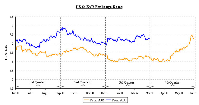 Our business has historically generated and continues to generate high levels of cash. At March 31, 2007 our cash balances were $118.9 million, which comprised mainly ZAR-denominated balances of ZAR 579.9 million ($79.7 million) and U.S. dollar-denominated balances of $35.0 million. Our cash balances declined from June 30, 2006 levels mainly as a result of the payment of the purchase price for Prism and the payment of provisional taxes, partially offset by the cash generated by operating activities.