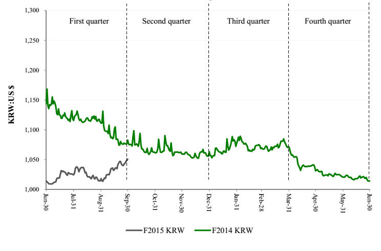 The following table illustrates the effect on our annual expected interest charge, translated at exchange rates applicable as of September 30, 2014, as a result of changes in the Korean CD. The effect of a hypothetical 1% increase and a 1% decrease in each of the Korean CD rate as of September 30, 2014, are shown. The selected 1% hypothetical change does not reflect what could be considered the best or worst case scenarios.