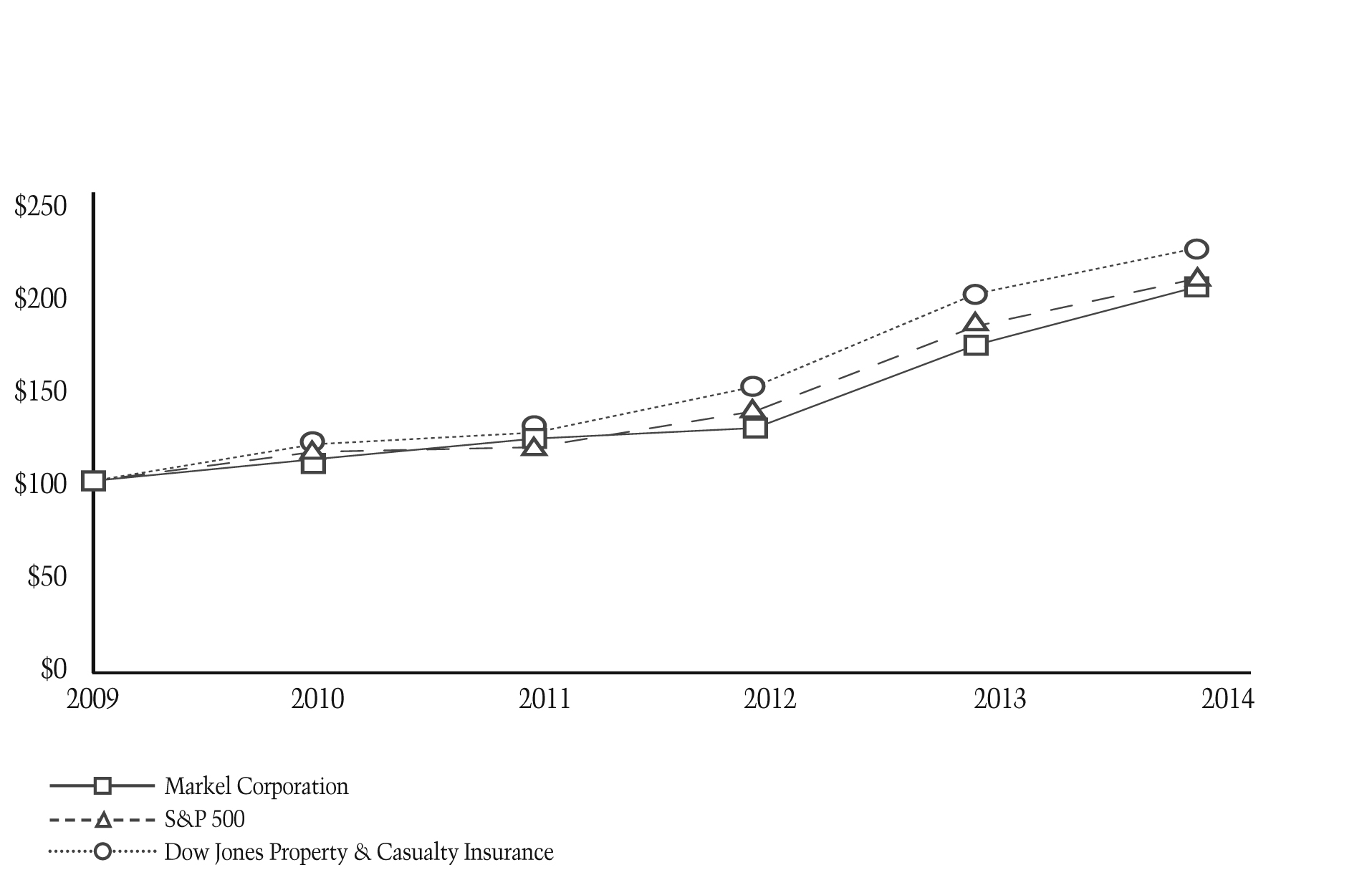 The following consolidated financial statements from Markel Corporation's Annual Report on Form 10-K for the year ended December 31, 2014, filed on February 27, 2015, formatted in XBRL: (i) Consolidated Balance Sheets, (ii) Consolidated Statements of Income and Comprehensive Income, (iii) Consolidated Statements of Changes in Equity, (iv) Consolidated Statements of Cash Flows and (v) Notes to Consolidated Financial Statements.**