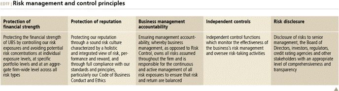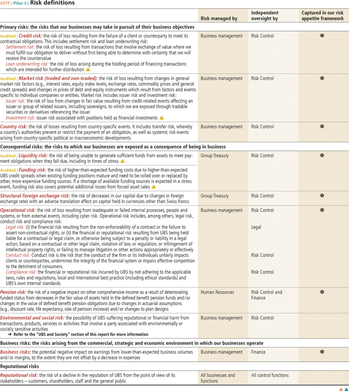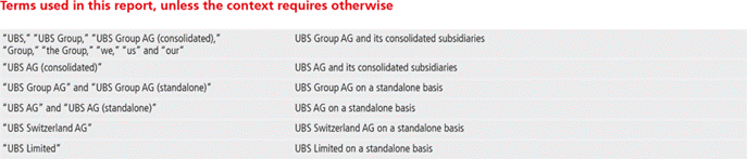 Cautionary StatementRegarding Forward-Looking Statements | This report contains statements that constitute “forward-looking statements,” including but not limited to management’s outlook for UBS’s financial performance and statements relating to the anticipated effect of transactions and strategic initiatives on UBS’s business and future development. While these forward-looking statements represent UBS’s judgments and expectations concerning the matters described, a number of risks, uncertainties and other important factors could cause actual developments and results to differ materially from UBS’s expectations. These factors include, but are not limited to: (i) the degree to which UBS is successful in executing its announced strategic plans, including its cost reduction and efficiency initiatives and its targets for risk-weighted assets (RWA) and leverage ratio denominator (LRD), and the degree to which UBS is successful in implementing changes to its wealth management businesses to meet changing market, regulatory and other conditions; (ii) the continuing low or negative interest rate environment, developments in the macroeconomic climate and in the markets in which UBS operates or to which it is exposed, including movements in securities prices or liquidity, credit spreads, and currency exchange rates, and the effect of economic conditions and market developments on the financial position or creditworthiness of UBS’s clients and counterparties; (iii) changes in the availability of capital and funding, including any changes in UBS’s credit spreads and ratings, as well as availability and cost of funding to meet requirements for debt that will be eligible for total loss-absorbing capacity (TLAC) requirements, or loss-absorbing capital; (iv) changes in or the implementation of financial legislation and regulation in Switzerland, the US, the UK and other financial centers that may impose, or result in, more stringent capital, TLAC, leverage ratio, liquidity and funding requirements, incremental tax requirements, additional levies, limitations on permitted activities, constraints on remuneration or other measures; (v) uncertainty as to when and to what degree the Swiss Financial Market Supervisory Authority (FINMA) will approve reductions to the incremental RWA resulting from the supplemental operational risk capital analysis mutually agreed to by UBS and FINMA, or will approve a limited reduction of capital or gone concern requirements due to measures to reduce resolvability risk; (vi) the degree to which UBS is successful in implementing changes to its legal structure to improve its resolvability and meet related regulatory requirements, including changes in legal structure and reporting required to implement US enhanced prudential standards, implementing a service company model, the transfer of the Asset Management business to a holding company, and the potential need to make further changes to the legal structure or booking model of UBS Group in response to legal and regulatory requirements relating to capital requirements, resolvability requirements and proposals in Switzerland and other countries for mandatory structural reform of banks and the extent to which such changes have the intended effects; (vii) changes in UBS’s competitive position, including whether differences in regulatory capital and other requirements among the major financial centers will adversely affect UBS’s ability to compete in certain lines of business; (viii) changes in the standards of conduct applicable to our businesses that may result from new regulation or new enforcement of existing standards, including measures to impose new or enhanced duties when interacting with customers or in the execution and handling of customer transactions; (ix) the liability to which UBS may be exposed, or possible constraints or sanctions that regulatory authorities might impose on UBS, due to litigation, contractual claims and regulatory investigations, including the potential for disqualification from certain businesses or loss of licenses or privileges as a result of regulatory or other governmental sanctions; (x) the effects on UBS’s cross-border banking business of tax or regulatory developments and of possible changes in UBS’s policies and practices relating to this business; (xi) UBS’s ability to retain and attract the employees necessary to generate revenues and to manage, support and control its businesses, which may be affected by competitive factors including differences in compensation practices; (xii) changes in accounting or tax standards or policies, and determinations or interpretations affecting the recognition of gain or loss, the valuation of goodwill, the recognition of deferred tax assets and other matters; (xiii) limitations on the effectiveness of UBS’s internal processes for risk management, risk control, measurement and modeling, and of financial models generally; (xiv) whether UBS will be successful in keeping pace with competitors in updating its technology, particularly in trading businesses; (xv) the occurrence of operational failures, such as fraud, misconduct, unauthorized trading, financial crime, cyber-attacks, and systems failures; (xvi) restrictions on the ability of UBS Group AG to make payments or distributions, including due to restrictions on the ability of its subsidiaries to make loans or distributions, directly or indirectly, or, in the case of financial difficulties, due to the exercise by FINMA of its broad statutory powers in relation to protective measures, restructuring and liquidation proceedings; (xvii) the degree to which changes in regulation, capital or legal structure, financial results or other factors, including methodology, assumptions and stress scenarios, may affect UBS’s ability to maintain its stated capital return objective; and (xviii) the effect that these or other factors or unanticipated events may have on our reputation and the a