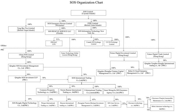 Subsidiaries inside China refers to the VIE’s subsidiaries, including SOS Information Technology Co.,Ltd (“SOSIT”), Inner Mongolia SOS Insurance Agency Co., Ltd (“IMSOS”); and directly owned subsidiaries including SOS International Trading Co., Ltd (“SOSINT”), Qingdao SOS Investment LLP (“SOSIL”), Qingdao SOS Digital Technologies Ltd. (“SOSDT”), Common Prosperity Technology Co., Ltd. (“SOSCP”), SOS Ronghe Digital Technology Co., Ltd. (“SOSRD”), Weigou International Trading Co., Ltd (“SOSWI”), Shuyun International Trading Co., Ltd (“SOSSI”), SOS Auto Service Co., Ltd. (“SOSAS”), and Chexiaoer Technology Co., Ltd (“SOSCX”).