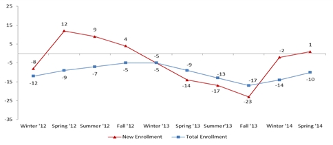Revenues decreased 15% to $229.2 million in the six months ended June 30, 2014 from $269.5 million in the six months ended June 30, 2013, principally due to lower average enrollment and a 3% decline in revenue per student. In late 2013, we introduced a new pricing structure for new undergraduate students which significantly reduces their cost of tuition. A shift in enrollment toward students eligible for the lower tuition has resulted in lower revenue per student.