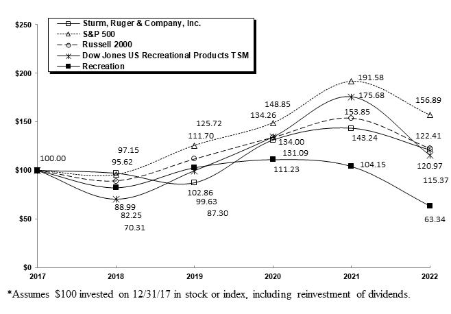STURM RUGER & CO INCYesNoYesYes111766423024306486243785684000000040000000116714338The beginning and ending liability balances represent accrued legal fees only. Settlements and administrative costs are expensed as incurred. Only in rare instances is an accrual established for settlements.The expense accrued in the liability is for legal fees only. In 2022 and 2021, the costs incurred related to cases that were settled or dismissed were less than the amounts accrued for these cases in prior years.Legal fees represent payments to outside counsel related to product liability matters.Settlements represent payments made to plaintiffs or allegedly injured parties in exchange for a full and complete release of liability.Insurance expense represents the cost of insurance premiums.falseFY000009502900000950292022-01-012022-12-3100000950292022-06-3000000950292023-02-1500000950292022-12-3100000950292021-12-310000095029us-gaap:NonvotingCommonStockMember2022-12-310000095029us-gaap:NonvotingCommonStockMember2021-12-310000095029us-gaap:CommonStockMember2022-12-310000095029us-gaap:CommonStockMember2021-12-310000095029rgr:FirearmsMember2022-01-012022-12-310000095029rgr:FirearmsMember2021-01-012021-12-310000095029rgr:FirearmsMember2020-01-012020-12-310000095029rgr:UnaffiliatedCastingsMember2022-01-012022-12-310000095029rgr:UnaffiliatedCastingsMember2021-01-012021-12-310000095029rgr:UnaffiliatedCastingsMember2020-01-012020-12-3100000950292021-01-012021-12-3100000950292020-01-012020-12-310000095029us-gaap:CommonStockMember2019-12-310000095029us-gaap:AdditionalPaidInCapitalMember2019-12-310000095029us-gaap:RetainedEarningsMember2019-12-310000095029us-gaap:TreasuryStockMember2019-12-3100000950292019-12-310000095029us-gaap:RetainedEarningsMember2020-01-012020-12-310000095029us-gaap:AdditionalPaidInCapitalMember2020-01-012020-12-310000095029us-gaap:CommonStockMember2020-01-012020-12-310000095029us-gaap:CommonStockMember2020-12-310000095029us-gaap:AdditionalPaidInCapitalMember2020-12-310000095029us-gaap:RetainedEarningsMember2020-12-310000095029us-gaap:TreasuryStockMember2020-12-3100000950292020-12-310000095029us-gaap:RetainedEarningsMember2021-01-012021-12-310000095029us-gaap:AdditionalPaidInCapitalMember2021-01-012021-12-310000095029us-gaap:CommonStockMember2021-01-012021-12-310000095029us-gaap:CommonStockMember2021-12-310000095029us-gaap:AdditionalPaidInCapitalMember2021-12-310000095029us-gaap:RetainedEarningsMember2021-12-310000095029us-gaap:TreasuryStockMember2021-12-310000095029us-gaap:RetainedEarningsMember2022-01-012022-12-310000095029us-gaap:AdditionalPaidInCapitalMember2022-01-012022-12-310000095029us-gaap:CommonStockMember2022-01-012022-12-310000095029us-gaap:TreasuryStockMember2022-01-012022-12-310000095029us-gaap:CommonStockMember2022-12-310000095029us-gaap:AdditionalPaidInCapitalMember2022-12-310000095029us-gaap:RetainedEarningsMember2022-12-310000095029us-gaap:TreasuryStockMember2022-12-310000095029us-gaap:SalesMemberus-gaap:CustomerConcentrationRiskMemberrgr:FirearmsMember2022-01-012022-12-310000095029us-gaap:SalesMemberus-gaap:CustomerConcentrationRiskMemberrgr:UnaffiliatedCastingsMember2022-01-012022-12-310000095029srt:MinimumMemberus-gaap:SalesMemberus-gaap:NonUsMember2022-01-012022-12-310000095029rgr:RemingtonOutdoorCompanyMembeMember2022-01-012022-12-310000095029us-gaap:BuildingMember2022-01-012022-12-310000095029us-gaap:MachineryAndEquipmentMember2022-01-012022-12-310000095029us-gaap:ToolsDiesAndMoldsMember2022-01-012022-12-310000095029rgr:InitialPurchasePriceAcquisitionMember2020-01-012020-12-310000095029rgr:InitialPurchasePriceAllocationMember2021-10-312021-12-310000095029rgr:MarlinAcquisitionMember2020-01-012020-12-310000095029srt:MaximumMemberrgr:MarlinAcquisitionMember2020-01-012020-12-310000095029srt:MinimumMemberrgr:MarlinAcquisitionMember2020-01-012020-12-310000095029rgr:InitialPurchasePriceAllocationMember2020-01-012020-12-310000095029rgr:MeasurementPeriodAdjustmentsMember2021-01-012021-12-310000095029rgr:FinalPurchasePriceAllocationMember2020-01-012020-12-310000095029rgr:InitialPurchasePriceAllocationMemberrgr:InventoryMember2020-12-310000095029rgr:MeasurementPeriodAdjustmentsMemberrgr:InventoryMember2021-12-310000095029rgr:FinalPurchasePriceAllocationMemberrgr:InventoryMember2020-12-310000095029rgr:InitialPurchasePriceAllocationMemberus-gaap:MachineryAndEquipmentMember2020-12-310000095029rgr:MeasurementPeriodAdjustmentsMemberus-gaap:MachineryAndEquipmentMember2021-12-310000095029rgr:FinalPurchasePriceAllocationMemberus-gaap:MachineryAndEquipmentMember2020-12-310000095029rgr:InitialPurchasePriceAllocationMemberus-gaap:TrademarksAndTradeNamesMember2020-12-310000095029rgr:FinalPurchasePriceAllocationMemberus-gaap:TrademarksAndTradeNamesMember2020-12-310000095029rgr:InitialPurchasePriceAllocationMemberus-gaap:PatentsMember2020-12-310000095029rgr:FinalPurchasePriceAllocationMemberus-gaap:PatentsMember2020-12-310000095029rgr:InitialPurchasePriceAllocationMemberus-gaap:CustomerRelationshipsMember2020-12-310000095029rgr:FinalPurchasePriceAllocationMemberus-gaap:CustomerRelationshipsMember2020-12-310000095029rgr:InitialPurchasePriceAllocationMemberus-gaap:GoodwillMember2020-12-310000095029rgr:MeasurementPeriodAdjustmentsMemberus-gaap:GoodwillMember2021-12-310000095029rgr:FinalPurchasePriceAllocationMemberus-gaap:GoodwillMember2020-12-310000095029rgr:InitialPurchasePriceAllocationMember2020-12-310000095029rgr:MeasurementPeriodAdjustmentsMember2021-12-310000095029rgr:FinalPurchasePriceAllocationMember2020-12-310000095029rgr:MarlinAcquisitionMemberus-gaap:TrademarksAndTradeNamesMember2022-01-012022-12-310000095029rgr:MarlinAcquisitionMemberus-gaap:PatentsMember2022-01-012022-12-310000095029rgr:MarlinAcquisitionMemberus-gaap:CustomerRelationshipsMember2022-01-012022-12-3100000950292021-01-012021-03-310000095029rgr:CustomerOneMemberus-gaap:AccountsReceivableMemberus-gaap:CustomerConcentrationRiskMember2022-01-012022-12-310000095029rgr:CustomerTwoMemberus-gaap:AccountsReceivableMemberus-gaap:Cus