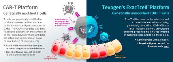 ExacTcell stands in contrast with both autologous and allogeneic CAR-T platforms, which target antigens present on both healthy and diseased cells and require genetic modification of the T cells. In autologous CAR-T approaches, the quantity and health of desired T cells in patient blood samples used to manufacture the CAR-T product have been among the largest obstacles for T cell therapies to date. Much of this is due to the chemotherapy treatments the patients have already received. Some existing CAR-T therapies may take weeks to manufacture, may require patients to receive pre-infusion lymphodepleting (i.e., immunosuppressing) chemotherapy as part of a lengthy preparation process, and be hospitalized in many cases during the CAR-T cell infusion or afterwards due to the frequency of side effects from the therapy such as cytokine release syndrome. These treatments may also require lifelong monitoring for the development and treatment of infections due to eradication of normal parts of the immune system along with the cancer.