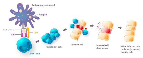 Killer T cells are white blood cells that play a vital role in the immune system’s defense against diseases, including viruses and cancer. Most CTLs, including those developed with ExacTcell, express T cell receptors (“TCRs”), which are surface proteins that provide each T cell with its unique immune specificity to recognize and react against specific foreign antigenic peptides of infected or malignant cells. These foreign antigenic peptides are presented in conjunction with an HLA molecule. The CTLs destroy their infected or malignant cell targets by inducing them to undergo apoptosis, or programmed cell death, by releasing cytolytic granules that produce pores in the target cell’s membrane. CTLs also possess a protein that spans the entirety of the cell membrane, known as Cluster Differentiation 8 (which makes them CD8+), that aids in the reaction. CD8+ T cells work in conjunction with HLA-class I molecules, and CD4+ T cells work in conjunction with HLA-class II molecules.