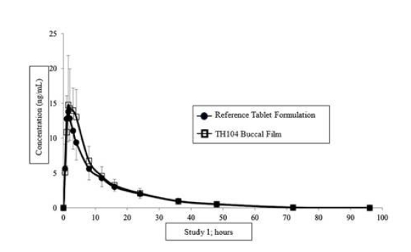 In this study, the pharmacokinetic evaluation of TH104 transmucosal film compared to an oral tablet marketed in Europe but not the United States, given as an equal-labelled dose in normal healthy volunteers under fasting conditions, was consistent and similar in comparison with results from the literature. The Cmax and AUC0-∞ of TH104 was observed to be higher than the tablet product because of a possible reduced presystemic metabolism in the lower GI and liver, which is potentially advantageous for patients with an impaired liver. The half-life and Tmax was observed to be similar for both products. There were no deaths, other serious adverse events, or other significant adverse events reported during the entire study with events consistent with the safety profile of the marketed tablet in the literature including mild dizziness, headache and somnolence, nausea and vomiting.