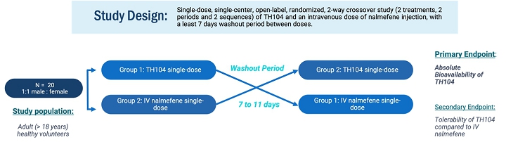 The Phase 1 trial was a single-dose, single-center, open-label, randomized 2-way crossover study comparing 16mg of TH104 with 1mg intravenous nalmefene administered under fasting conditions, with a 7-day washout period between doses. Twenty healthy subjects were enrolled to complete both doses of the crossover design. All 20 subjects completed TH104 buccal dosing, while 19 of 20 subjects also completed the intravenous dosing. The primary objective was to evaluate the absolute bioavailability of TH104, as well as to assess safety and tolerability.