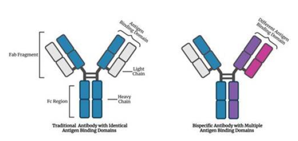 A large number of traditional antibodies are composed of immunoglobin G (IgG) format in a Y-shape molecule consisting of two heavy chains which are identical as well as two light chains also identical. A heavy chain pairs with a light chain to form two variable regions, or antibody binding fragment (Fab) which binds to antigens of the target. The constant region includes a region referred to as the fragment crystallizable (Fc) which binds to receptors present on cells in the immune system known as effector cells. In traditional full length monoclonal antibodies, the variable regions are identical and bind to the same target.