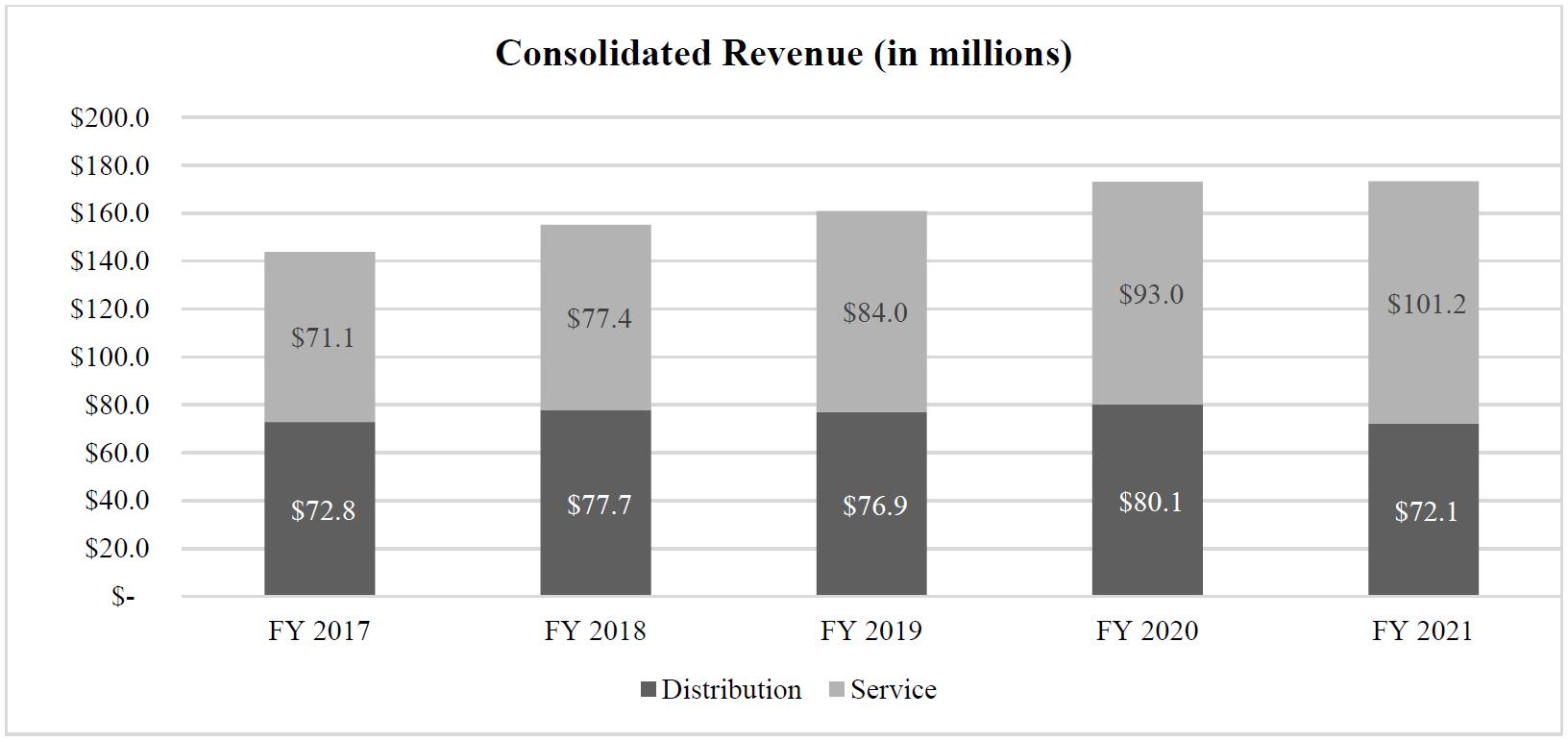 We believe our combined Service and Distribution segment offerings, experience, technical expertise and integrity create a unique and compelling value proposition for our customers, and we intend to continue to grow our business through organic revenue growth and business acquisitions. We consider the attributes of our Service segment, which include higher gross margins and recurring revenue streams from customers in regulated industries to be more compelling and scalable than our legacy Distribution segment. For this reason, we expect our Service segment to be the primary source of revenue and earnings growth in future fiscal years. The charts below illustrate Service, Distribution and consolidated revenue over the past five years: