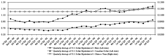 Trends for the Euro, Canadian Dollar and Chinese Yuan are shown in the chart below: