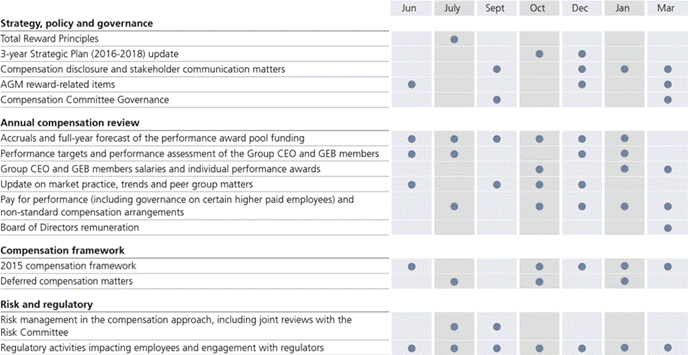 Annual publications: Annual report (SAP no. 80531): Published in both English and German, this single volume report provides a description of our Group strategy and performance; the strategy and performance of the business divisions and the Corporate Center; a description of risk, treasury, capital management, corporate governance, responsibility and senior management compensation, including compensation for the Board of Directors and the Group Executive Board members; and financial information, including the financial statements. Review (SAP no. 80530): The booklet contains key information on our strategy and financials. It is published in English, German, French and Italian. Compensation Report (SAP no. 82307): The report discusses our compensation framework and provides information on compensation for the Board of Directors and the Group Executive Board members. It is published in English and German.