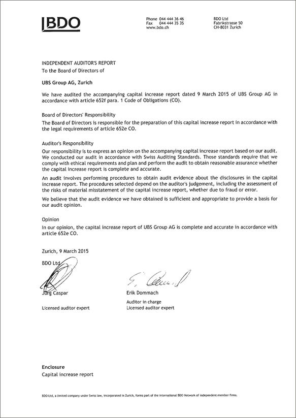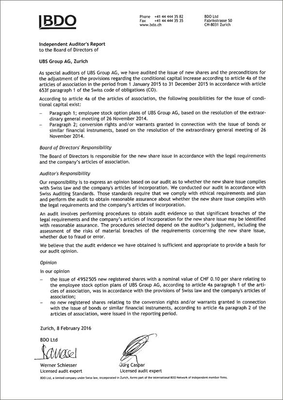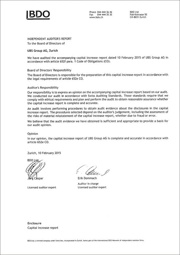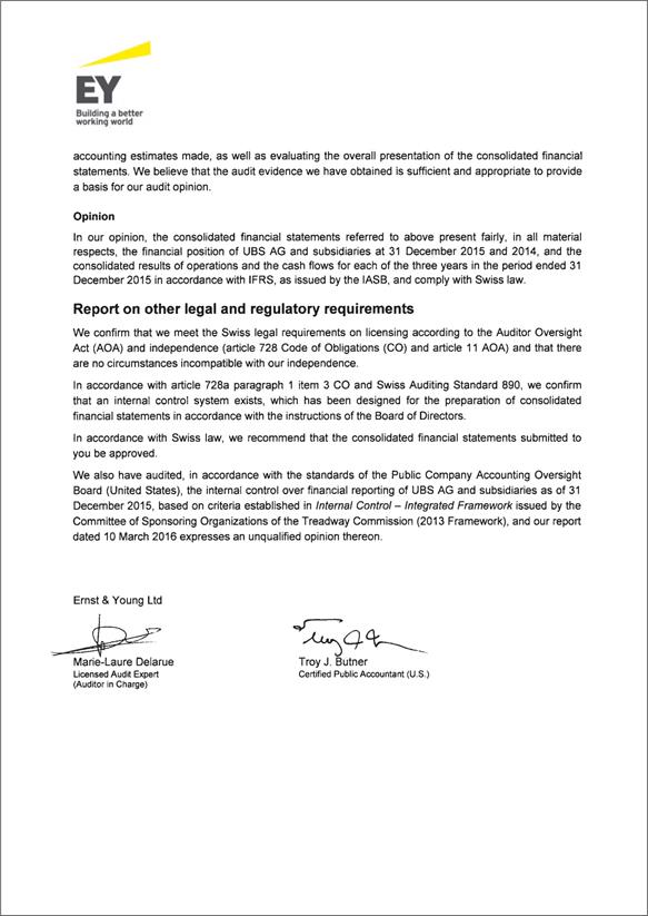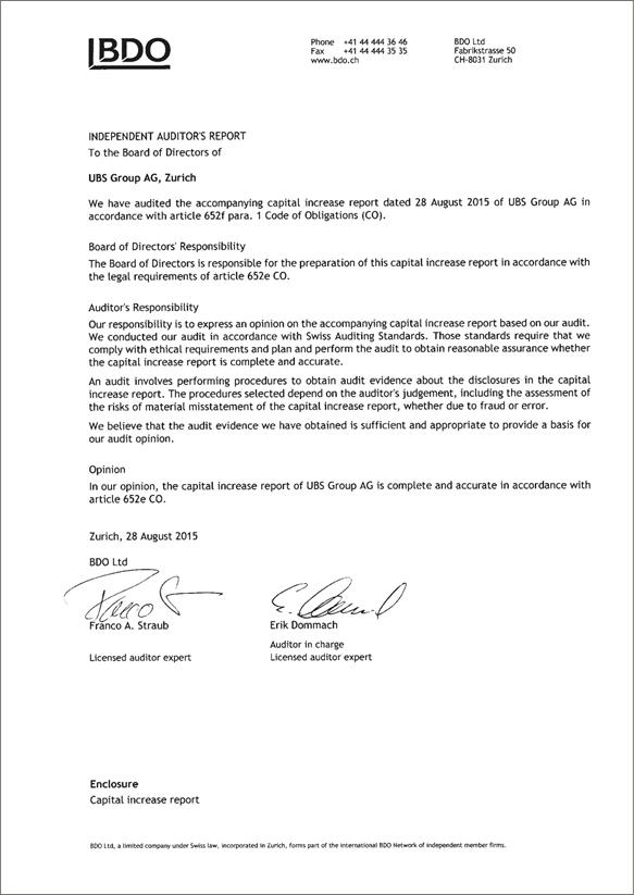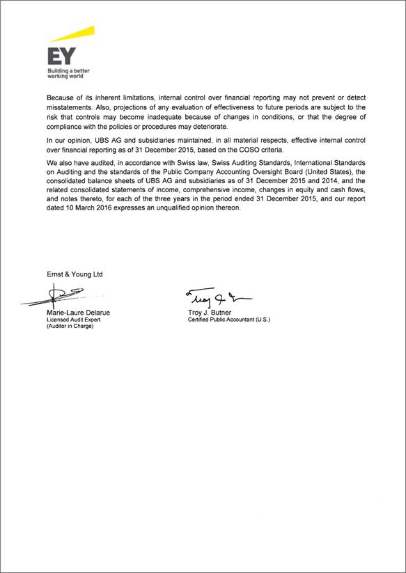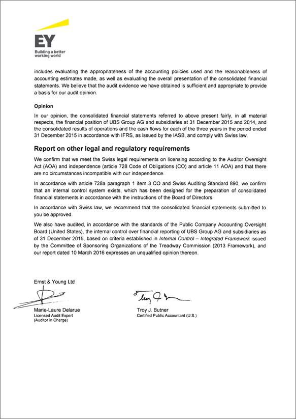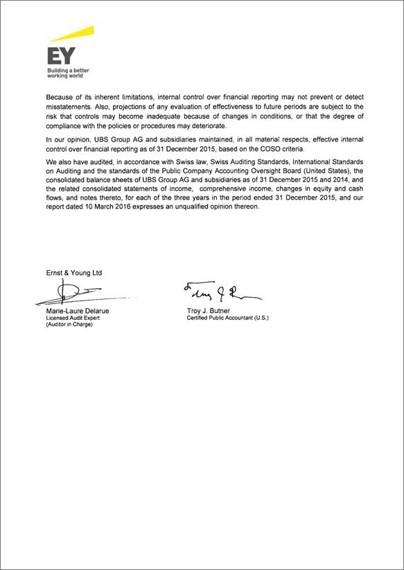 Cautionary StatementRegarding Forward-Looking Statements | This report contains statements that constitute “forward-looking statements,” including but not limited to management’s outlook for UBS’s financial performance and statements relating to the anticipated effect of transactions and strategic initiatives on UBS’s business and future development. While these forward-looking statements represent UBS’s judgments and expectations concerning the matters described, a number of risks, uncertainties and other important factors could cause actual developments and results to differ materially from UBS’s expectations. These factors include, but are not limited to: (i) the degree to which UBS is successful in executing its announced strategic plans, including its cost reduction and efficiency initiatives and its targets for risk-weighted assets (RWA) and leverage ratio denominator (LRD), and the degree to which UBS is successful in implementing changes to its wealth management businesses to meet changing market, regulatory and other conditions; (ii) the continuing low or negative interest rate environment, developments in the macroeconomic climate and in the markets in which UBS operates or to which it is exposed, including movements in securities prices or liquidity, credit spreads, and currency exchange rates, and the effect of economic conditions and market developments on the financial position or creditworthiness of UBS’s clients and counterparties; (iii) changes in the availability of capital and funding, including any changes in UBS’s credit spreads and ratings, as well as availability and cost of funding to meet requirements for debt that will be eligible for total loss-absorbing capacity (TLAC) requirements, or loss-absorbing capital; (iv) changes in or the implementation of financial legislation and regulation in Switzerland, the US, the UK and other financial centers that may impose, or result in, more stringent capital, TLAC, leverage ratio, liquidity and funding requirements, incremental tax requirements, additional levies, limitations on permitted activities, constraints on remuneration or other measures; (v) uncertainty as to when and to what degree the Swiss Financial Market Supervisory Authority (FINMA) will approve reductions to the incremental RWA resulting from the supplemental operational risk capital analysis mutually agreed to by UBS and FINMA, or will approve a limited reduction of capital or gone concern requirements due to measures to reduce resolvability risk; (vi) the degree to which UBS is successful in implementing changes to its legal structure to improve its resolvability and meet related regulatory requirements, including changes in legal structure and reporting required to implement US enhanced prudential standards, implementing a service company model, the transfer of the Asset Management business to a holding company, and the potential need to make further changes to the legal structure or booking model of UBS Group in response to legal and regulatory requirements relating to capital requirements, resolvability requirements and proposals in Switzerland and other countries for mandatory structural reform of banks and the extent to which such changes have the intended effects; (vii) changes in UBS’s competitive position, including whether differences in regulatory capital and other requirements among the major financial centers will adversely affect UBS’s ability to compete in certain lines of business; (viii) changes in the standards of conduct applicable to our businesses that may result from new regulation or new enforcement of existing standards, including measures to impose new or enhanced duties when interacting with customers or in the execution and handling of customer transactions; (ix) the liability to which UBS may be exposed, or possible constraints or sanctions that regulatory authorities might impose on UBS, due to litigation, contractual claims and regulatory investigations, including the potential for disqualification from certain businesses or loss of licenses or privileges as a result of regulatory or other governmental sanctions; (x) the effects on UBS’s cross-border banking business of tax or regulatory developments and of possible changes in UBS’s policies and practices relating to this business; (xi) UBS’s ability to retain and attract the employees necessary to generate revenues and to manage, support and control its businesses, which may be affected by competitive factors including differences in compensation practices; (xii) changes in accounting or tax standards or policies, and determinations or interpretations affecting the recognition of gain or loss, the valuation of goodwill, the recognition of deferred tax assets and other matters; (xiii) limitations on the effectiveness of UBS’s internal processes for risk management, risk control, measurement and modeling, and of financial models generally; (xiv) whether UBS will be successful in keeping pace with competitors in updating its technology, particularly in trading businesses; (xv) the occurrence of operational failures, such as fraud, misconduct, unauthorized trading, financial crime, cyber-attacks, and systems failures; (xvi) restrictions on the ability of UBS Group AG to make payments or distributions, including due to restrictions on the ability of its subsidiaries to make loans or distributions, directly or indirectly, or, in the case of financial difficulties, due to the exercise by FINMA of its broad statutory powers in relation to protective measures, restructuring and liquidation proceedings; (xvii) the degree to which changes in regulation, capital or legal structure, financial results or other factors, including methodology, assumptions and stress scenarios, may affect UBS’s ability to maintain its stated capital return objective; and (xviii) the effect that these or other factors or unanticipated events may have on our reputation and the a