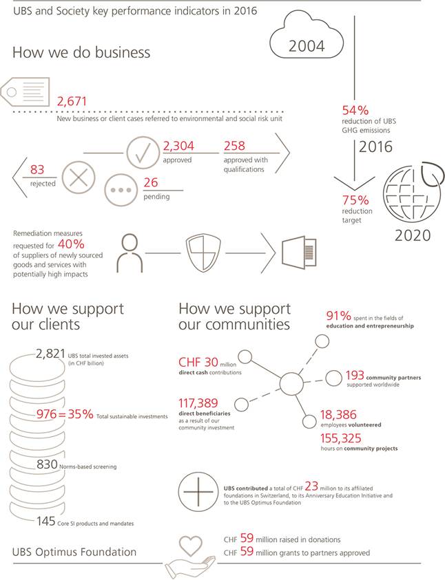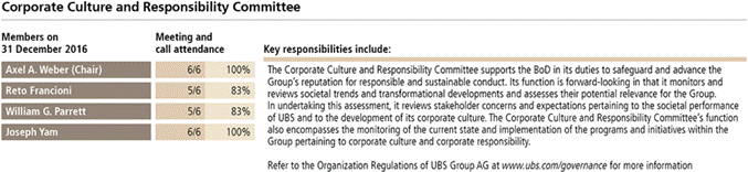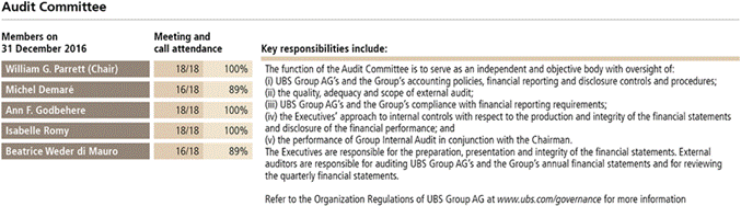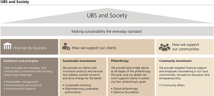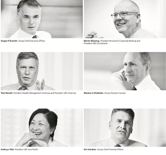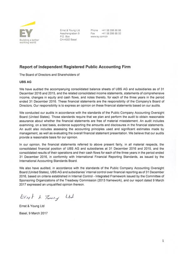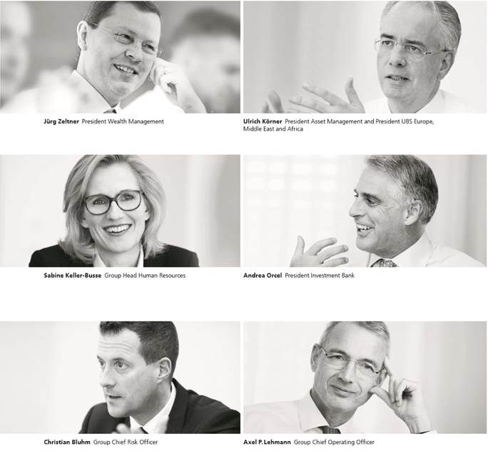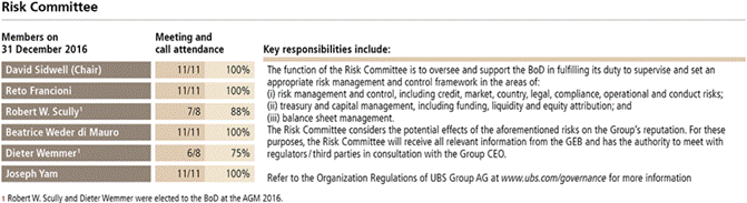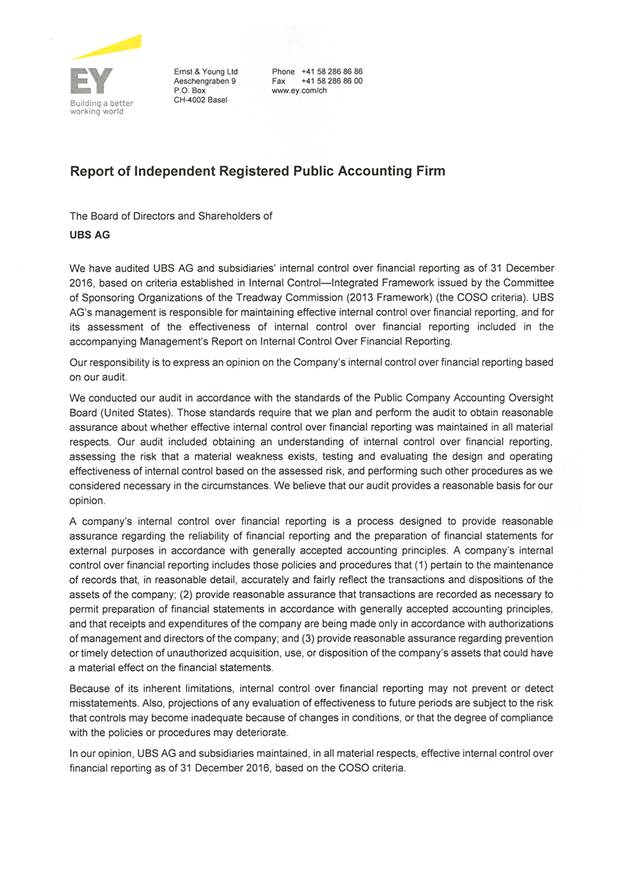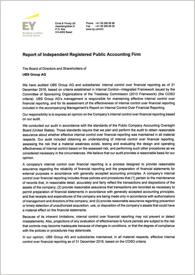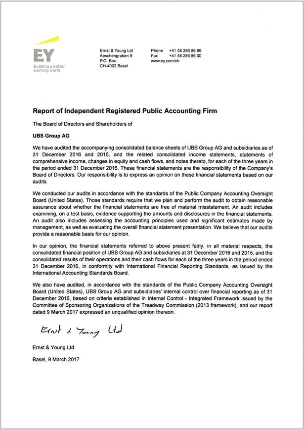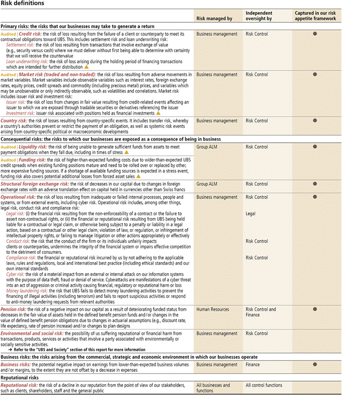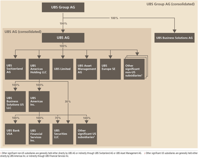 Cautionary StatementRegarding Forward-Looking Statements | This report contains statements that constitute “forward-looking statements,” including but not limited to management’s outlook for UBS’s financial performance and statements relating to the anticipated effect of transactions and strategic initiatives on UBS’s business and future development. While these forward-looking statements represent UBS’s judgments and expectations concerning the matters described, a number of risks, uncertainties and other important factors could cause actual developments and results to differ materially from UBS’s expectations. These factors include, but are not limited to: (i) the degree to which UBS is successful in the ongoing execution of its strategic plans, including its cost reduction and efficiency initiatives and its ability to manage its levels of risk-weighted assets (RWA) and leverage ratio denominator, liquidity coverage ratio and other financial resources, and the degree to which UBS is successful in implementing changes to its wealth management businesses to meet changing market, regulatory and other conditions; (ii) continuing low or negative interest rate environment, developments in the macroeconomic climate and in the markets in which UBS operates or to which it is exposed, including movements in securities prices or liquidity, credit spreads, and currency exchange rates, and the effects of economic conditions, market developments, and geopolitical tensions on the financial position or creditworthiness of UBS’s clients and counterparties as well as on client sentiment and levels of activity; (iii) changes in the availability of capital and funding, including any changes in UBS’s credit spreads and ratings, as well as availability and cost of funding to meet requirements for debt eligible for total loss-absorbing capacity (TLAC); (iv) changes in or the implementation of financial legislation and regulation in Switzerland, the US, the UK and other financial centers that may impose, or result in, more stringent capital, TLAC, leverage ratio, liquidity and funding requirements, incremental tax requirements, additional levies, limitations on permitted activities, constraints on remuneration, constraints on transfers of capital and liquidity and sharing of operational costs across the Group or other measures, and the effect these would have on UBS’s business activities; (v) uncertainty as to when and to what degree the Swiss Financial Market Supervisory Authority (FINMA) will approve, or confirm, limited reductions of gone concern requirements due to measures to reduce resolvability risk; (vi) the degree to which UBS is successful in implementing further changes to its legal structure to improve its resolvability and meet related regulatory requirements, including changes in legal structure and reporting required to implement US enhanced prudential standards, completing the implementation of a service company model, and the potential need to make further changes to the legal structure or booking model of UBS Group in response to legal and regulatory requirements relating to capital requirements, resolvability requirements and proposals in Switzerland and other jurisdictions for mandatory structural reform of banks or systemically important institutions and the extent to which such changes will have the intended effects; (vii) the uncertainty arising from the timing and nature of the UK exit from the EU and the potential need to make changes in UBS’s legal structure and operations as a result of it; (viii) changes in UBS’s competitive position, including whether differences in regulatory capital and other requirements among the major financial centers will adversely affect UBS’s ability to compete in certain lines of business; (ix) changes in the standards of conduct applicable to our businesses that may result from new regulation or new enforcement of existing standards, including recently enacted and proposed measures to impose new and enhanced duties when interacting with customers and in the execution and handling of customer transactions; (x) the liability to which UBS may be exposed, or possible constraints or sanctions that regulatory authorities might impose on UBS, due to litigation, contractual claims and regulatory investigations, including the potential for disqualification from certain businesses or loss of licenses or privileges as a result of regulatory or other governmental sanctions, as well as the effect that litigation, regulatory and similar matters have on the operational risk component of our RWA; (xi) the effects on UBS’s cross-border banking business of tax or regulatory developments and of possible changes in UBS’s policies and practices relating to this business; (xii) UBS’s ability to retain and attract the employees necessary to generate revenues and to manage, support and control its businesses, which may be affected by competitive factors including differences in compensation practices; (xiii) changes in accounting or tax standards or policies, and determinations or interpretations affecting the recognition of gain or loss, the valuation of goodwill, the recognition of deferred tax assets and other matters; (xiv) limitations on the effectiveness of UBS’s internal processes for risk management, risk control, measurement and modeling, and of financial models generally; (xv) whether UBS will be successful in keeping pace with competitors in updating its technology, including by developing digital channels and tools and in our trading businesses; (xvi) the occurrence of operational failures, such as fraud, misconduct, unauthorized trading, financial crime, cyberattacks, and systems failures; (xvii) restrictions on the ability of UBS Group AG to make payments or distributions, including due to restrictions on the ability of its subsidiaries to make loans or distributions, directly or indirectly, or, in the case of financial difficult