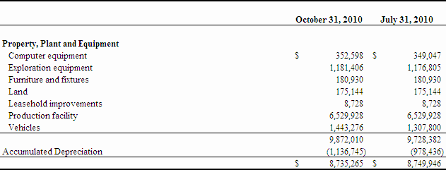 The Company commenced operations on May 16, 2003 and has not realized any significant revenues since inception. As at October 31, 2010, the Company has working capital of $34,784,257 and an accumulated deficit of $77,283,793. Although existing cash resources are currently expected to provide sufficient funds through the upcoming year, the capital expenditures required to achieve planned principal operations may be substantial. The continuation of the Company as a going concern for a period of longer than the upcoming year is dependent upon the ability of the Company to obtain necessary financing to continue operations. The Company is in the exploration stage of its mineral property development and to date has not yet established any proven mineral reserves on its existing properties. The continued operations of the Company and the recoverability of the carrying value of its assets are ultimately dependent upon the ability of the Company to achieve profitable operations. To date, the Company has completed private placements and received funding through the exercise of stock options and share purchase warrants for net proceeds of $94,420,784 from the issuance of shares of the Company's common stock.