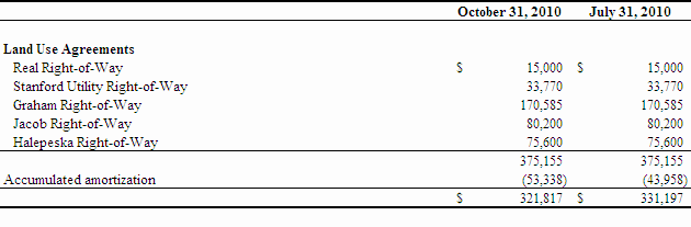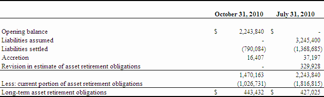 Net cash used in operating activities during the three months ended October 31, 2010 was $6,291,068 compared to $2,310,139 during the same period ended October 31, 2009. Significant operating expenditures during the current period included mineral property expenditures, general and administrative costs, management fees and professional fees. In addition, the Company spent $790,084 in settlement of asset retirement obligations.